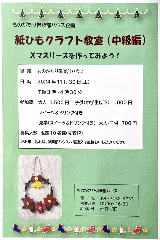 11/30(土)に開催した「紙ひもクラフト教室(中級編)」では、クリスマスシーズンに向けて素敵なリース作りに挑戦しました。