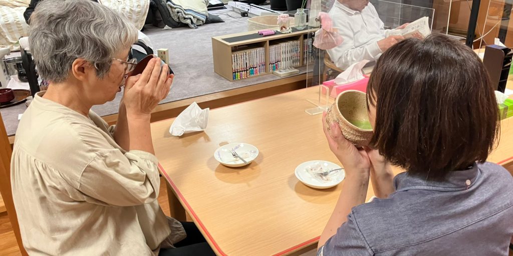 協力して準備を整えた後は、点てたてのお抹茶をゆっくりと味わいます。