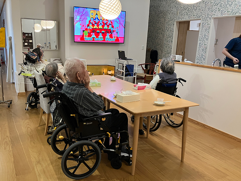 おやつを囲みながら、お雛様を眺めたり、昔の思い出話をしたり。参加された皆様も、テレビに映る雛壇をじっくりと眺めながら、ゆったりとした時間を過ごされていました。皆様の穏やかで優しい表情を拝見し、私たち職員も温かい気持ちになり、たくさんの元気をいただきました。