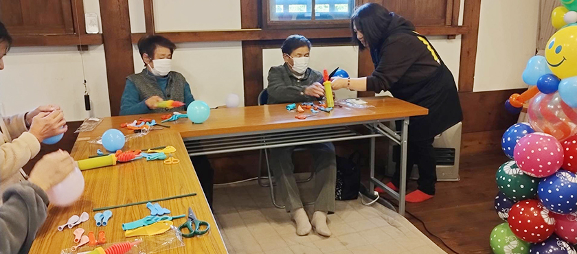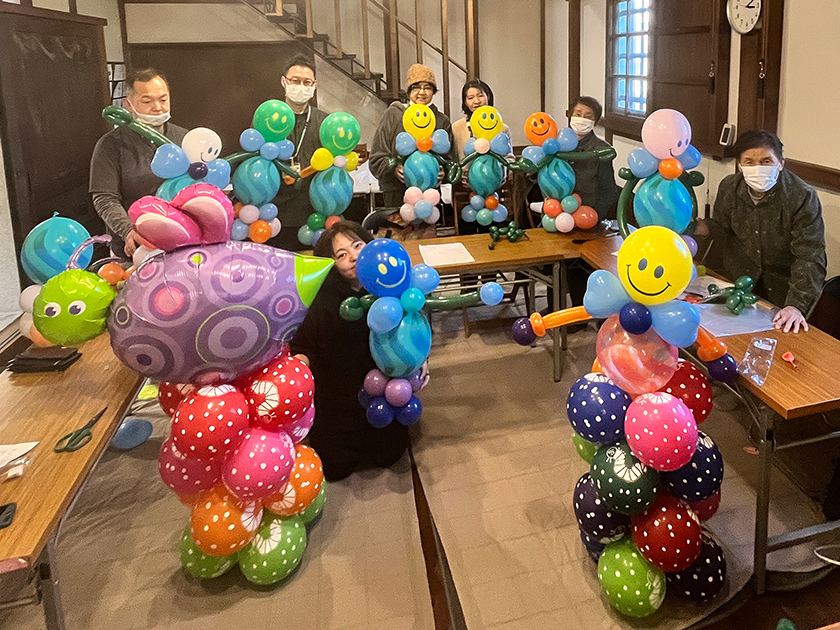 この作品は、ワークショップ終了後にさっそく「ものがたりの郷」へお届けしました。 ダイナミックで可愛らしいバルーンを目にした利用者の皆さんは、「すごい!」「きれいだねぇ」と大喜び!施設が一気に華やかな雰囲気に包まれました。